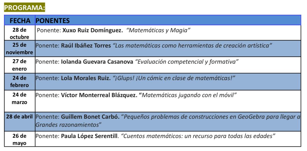 Si vas a comentar en las redes, etiqueta a la Sociedad Extremeña de Educación Matemática Ventura Reyes Prósper y usa el hashtag #matemartesconlaseem