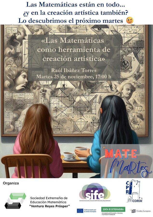 Este martes 25 de noviembre a las 17:00 tenemos el último matemartes del 2025. Será una ponencia de lo más creativa acompañados por Raúl Ibañez Torres que nos desvelará algunos secretos de las «Matemáticas como herramienta de creación artística«
