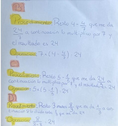 Con las cuatro cifras que tienes en cada caso y utilizando las operaciones elementales: suma, resta, multiplicación y fracciones, consigue el número 24